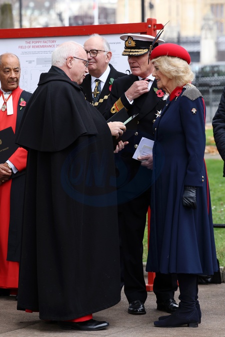 Dean of Westminster, the Very Reverend Dr David Hoyle greets Queen Camilla as she visits the 97th Field Of Remembrance at Westminster Abbey on November 06, 2025 in London, England. The Field of Remembrance has been held every November since 1928 when The Poppy Factory, of which Queen Camilla is Patron, brought a group of disabled veterans, a tray of poppies and a collecting tin to the grounds of St Margaret's Church at Westminster Abbey., Credit:Avalon.red / Avalon