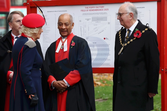 Queen Camilla speaks with Sir Kenneth Olisa OBE and Councillor Paul Dimoldenberg during a visit to the 97th Field Of Remembrance at Westminster Abbey on November 06, 2025 in London, England. The Field of Remembrance has been held every November since 1928 when The Poppy Factory, of which Queen Camilla is Patron, brought a group of disabled veterans, a tray of poppies and a collecting tin to the grounds of St Margaret's Church at Westminster Abbey., Credit:Avalon.red / Avalon