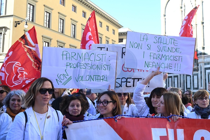 Private pharmacy workers held a strike and protest for the renewal of the national labor contract, which expired in 2024. The strike was called by CGIL, Filcams, CISL, FISASCAT, and UILTCUS. Florence, Italy 06 November 2025, Credit:Aleandro Biagianti / Avalon