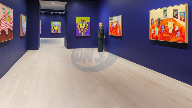 London, UK. 06th Nov, 2025. Staff with a selection of works - general view. 'Some Very, Very, Very New Paintings not yet Shown in Paris' debuts never-seen-before paintings completed in David Hockney's London studio over the last six months. The show is the inaugural exhibition at Annely Juda Fine Art's new space on Hanover Square., Credit:Imageplotter / Avalon