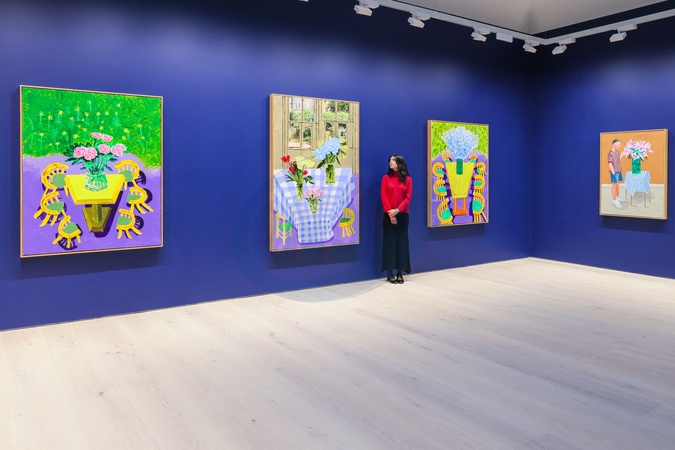 London, UK. 06th Nov, 2025. Staff with left to right, Pink Roses on Show, August 2025, Three Vases on a Table, Inside, August 2025, and Delphiniums on My Garden Table, July 2025, and Richard with Flowers, August 2025. 'Some Very, Very, Very New Paintings not yet Shown in Paris' debuts never-seen-before paintings completed in David Hockney's London studio over the last six months. The show is the inaugural exhibition at Annely Juda Fine Art's new space on Hanover Square., Credit:Imageplotter / Avalon