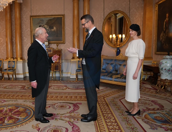 Sven Sakkov, Ambassador of Estonia, accompanied by Marika Flaur, presents his credentials to King Charles III during a private audience at Buckingham Palace, London. Picture date: Thursday November 6, 2025., Credit:Yui Mok / Avalon