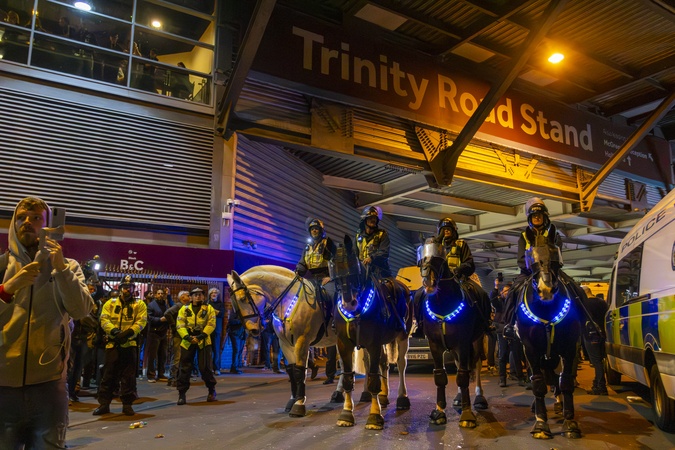 Pro-Palestine protesters gathered outside Villa Park Stadium in Birmingham as Aston Villa hosted Israeli football club Maccabi Tel Aviv. Demonstrators condemned Israel's actions in Gaza and called for sporting boycotts against Israeli teams., Credit:Zak Irfan / Avalon