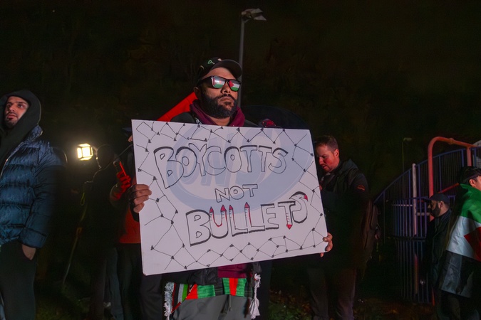 Pro-Palestine protesters gathered outside Villa Park Stadium in Birmingham as Aston Villa hosted Israeli football club Maccabi Tel Aviv. Demonstrators condemned Israel's actions in Gaza and called for sporting boycotts against Israeli teams., Credit:Zak Irfan / Avalon