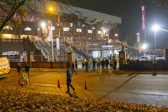 Pro-Palestine protesters gathered outside Villa Park Stadium in Birmingham as Aston Villa hosted Israeli football club Maccabi Tel Aviv. Demonstrators condemned Israel's actions in Gaza and called for sporting boycotts against Israeli teams., Credit:Zak Irfan / Avalon