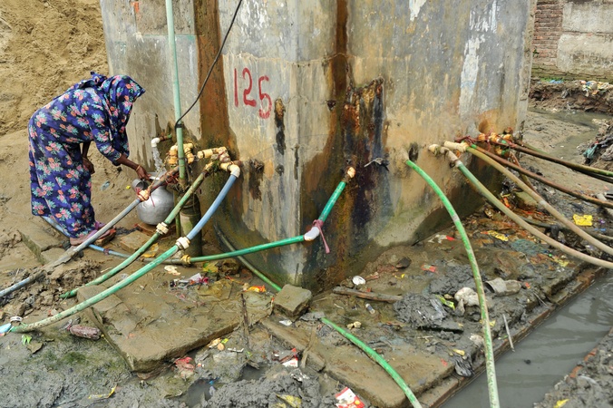 Chattogram, Bangladesh: Women collect water from a deep tube-well in Bakalia area. Most local wells are saline or iron-contaminated, usable only for washing and other cleaning purposes. For drinking, people rely on limited rainwater and private motor pumps, while those who can afford it buy filtered water at 20–40 Tk per 20-liter pot from local dealer., Credit:Md Rafayat Haque Khan / Avalon