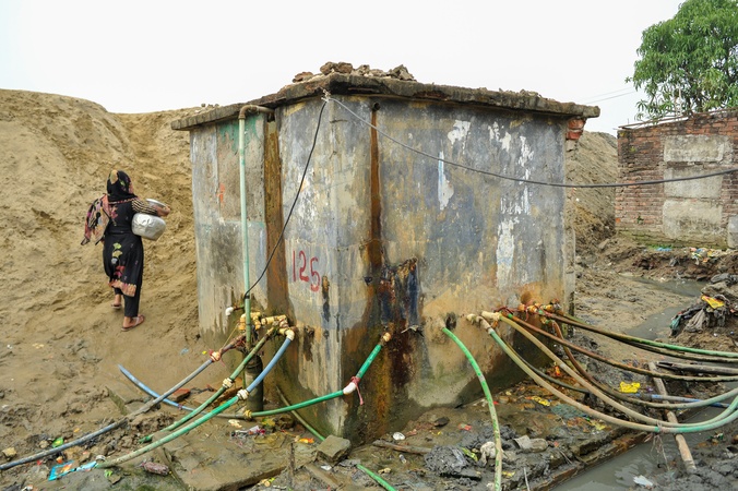 Chattogram, Bangladesh: Women collect water from a deep tube-well in Bakalia area. Most local wells are saline or iron-contaminated, usable only for washing and other cleaning purposes. For drinking, people rely on limited rainwater and private motor pumps, while those who can afford it buy filtered water at 20–40 Tk per 20-liter pot from local dealer., Credit:Md Rafayat Haque Khan / Avalon