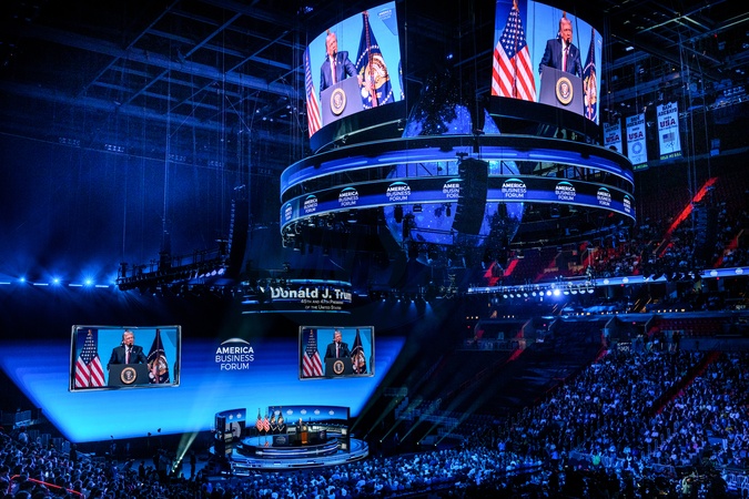 President Donald Trump delivers remarks at the America Business Forum Miami at the Kaseya Center in Miami, Florida, Wednesday, November 5, 2025., Credit:Molly Riley / Avalon