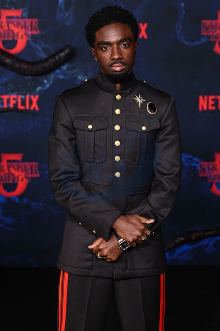 HOLLYWOOD, LOS ANGELES, CALIFORNIA, USA - NOVEMBER 06: Caleb McLaughlin wearing Wales Bonner FW25 RTW, specifically Look 15 from the Autumn Winter 2025 ‘Selah' Collection and a Hublot timepiece arrives at the Los Angeles Premiere Of Netflix's 'Stranger Things' Season 5 held at the TCL Chinese Theatre IMAX on November 6, 2025 in Hollywood, Los Angeles, California, United States., Credit:Xavier Collin / Avalon