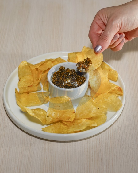 N25 Oscietra Caviar with Neal's Yard Dairy Crème France and Torres Black Truffle Potato Crisps at Nekter Deli in Shoreditch, London, Credit:Mario Mitsis / Avalon