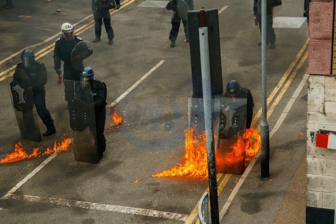 London's Metropolitan Police training in the face of extreme civil disorder, featuring the use of petrol bombs/molotov cocktails. This training took place in conjunction with the NUJ and their visit to the Metropolitan Police Specialist Training Centre in Gravesend, Kent, UK, 7 November 2025, Credit:Alex Day / Avalon