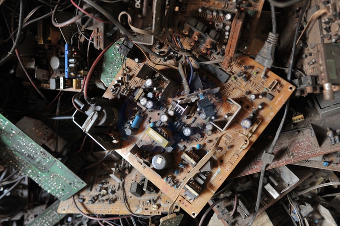 Chattogram, Bangladesh: Computer waste products stored in a warehouse in Chittagong, Bangladesh. Discarded electronic components such as memory chips and circuit boards are part of the growing global e-waste stream. Market demanding countries like Pakistan, China, Hong Kong, and Dubai, similar materials are collected and recycled to recover valuable metals and reusable parts. Asia faces a high demand for e-waste recycling due to its role as both a major producer and consumer of electronics, resulting in large volumes of waste., Credit:Md Rafayat Haque Khan / Avalon