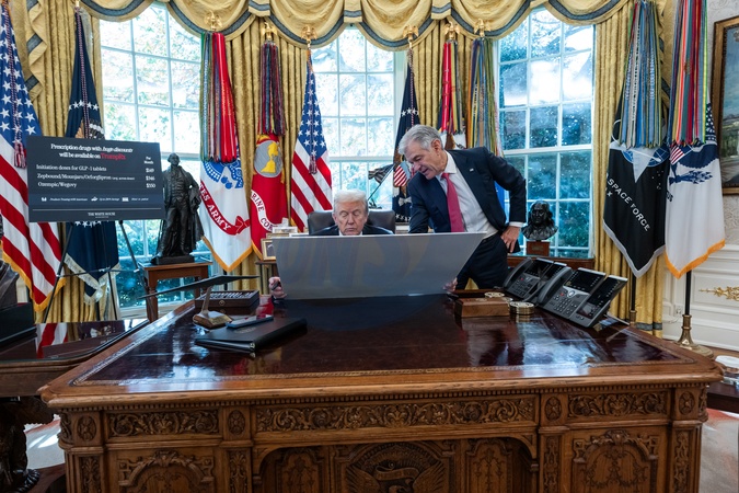 President Donald Trump speaks with CMMS Administrator Dr. Mehmet Oz before a press conference announcing the lowering of drug prices in the Oval Office, Thursday, November 6, 2025., Credit:Abe McNatt / Avalon