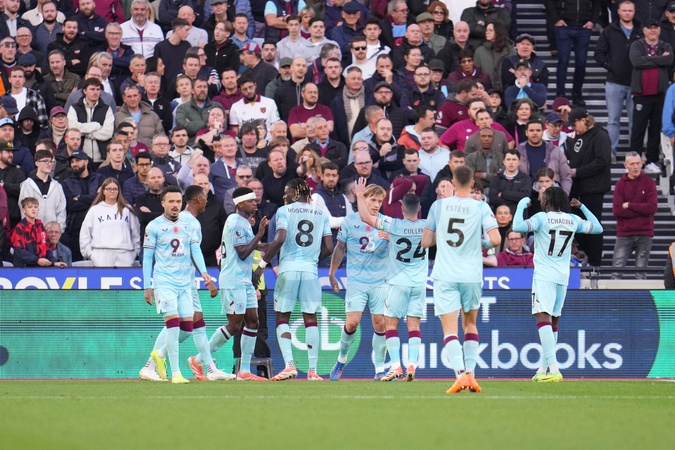 Burnley players celebrate Zian Flemming of Burnley goal to make it 0-1 during the Premier League match West Ham United vs Burnley at London Stadium, London, United Kingdom, 8th November 2025, Credit:Harvey Murphy/News Images / Avalon