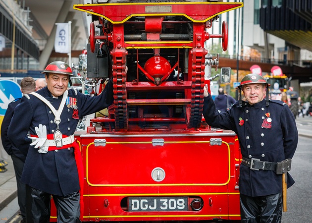 London, UK. 08th Nov, 2025. Max Dissanayake, Clerk with the Worshipful Company of Firefighters, (left) and his colleague, pose with a historic fire engine which will take part in the procession. Early morning preparations around the Guildhall. The three-mile long procession showcases tradition, pageantry, as well as the modern City of London with military bands, livery companies, community groups, charities and others, featuring around 7, 000 participants, 200 horses and over 50 decorated floats. For the first time in its 800 year history, the procession is called Lady Mayor's Show as the new Lady Mayor, Dame Susan Langley DBE, is welcomed to the City of London., Credit:Imageplotter / Avalon