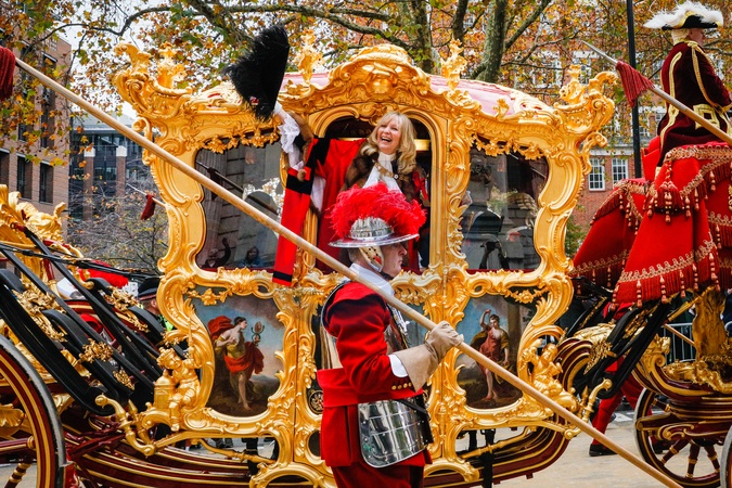 London, UK. 08th Nov, 2025. The New Lady Mayor, Dame Susan Langley DBE, waves from the gilded State Carriage en route. For the first time in its 800-year history, the Lord Mayor's Show becomes the Lady Mayor's Show, a historic milestone for the City of London. Dame Susan is the third woman to hold the role, but the first to adopt the title "Lady Mayor.", Credit:Imageplotter / Avalon