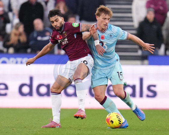 Lucas Paqueta of West Ham United and Zian Flemming of Burnley battle for the ball during the Premier League match West Ham United vs Burnley at London Stadium, London, United Kingdom, 8th November 2025, Credit:Harvey Murphy/News Images / Avalon