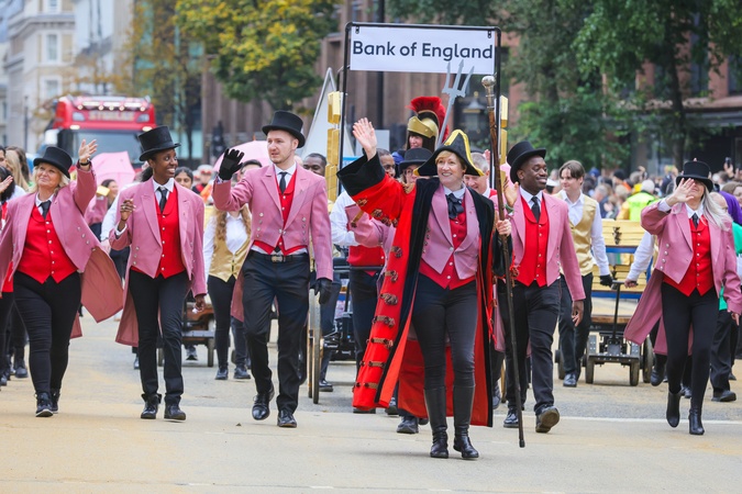 London, UK. 08th Nov, 2025. Participants with the Bank of England wave and smile. The three-mile long procession showcases tradition, pageantry, as well as the modern City of London with military bands, livery companies, community groups, charities and others, featuring around 7, 000 participants, 200 horses and over 50 decorated floats. For the first time in its 800 year history, the procession is called Lady Mayor's Show as the new Lady Mayor, Dame Susan Langley DBE, is welcomed to the City of London., Credit:Imageplotter / Avalon