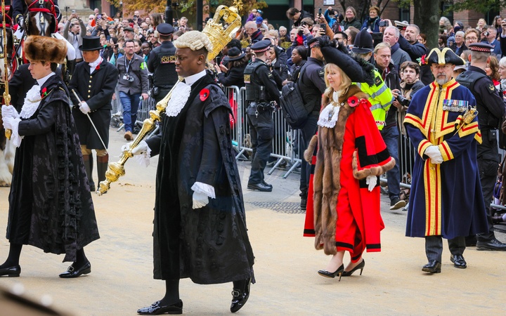 London, UK. 08th Nov, 2025. The New Lady Mayor, Dame Susan Langley DBE, together with her partner, arrives at St Paul's in the gilded State Carriage and receives a blessing outside the church. For the first time in its 800-year history, the Lord Mayor's Show becomes the Lady Mayor's Show, a historic milestone for the City of London. Dame Susan is the third woman to hold the role, but the first to adopt the title "Lady Mayor.", Credit:Imageplotter / Avalon