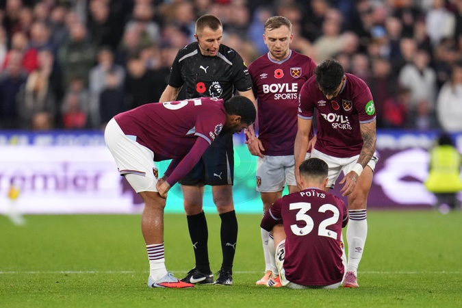 Freddie Potts of West Ham United goes down injured and comes off during the Premier League match West Ham United vs Burnley at London Stadium, London, United Kingdom, 8th November 2025, Credit:Harvey Murphy/News Images / Avalon