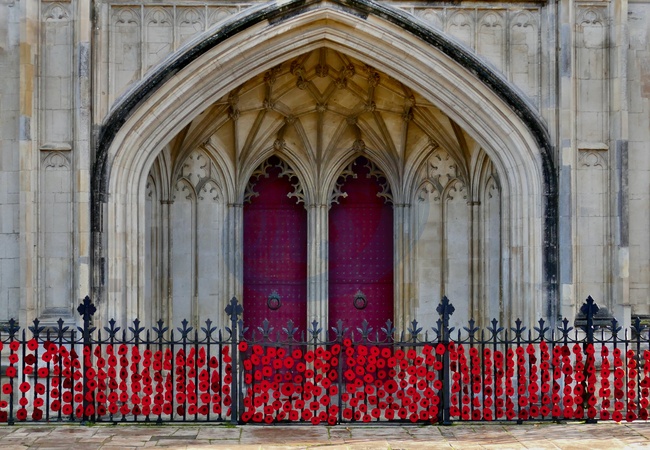 Knitted poppies are attached to the railings at Winchester Cathedral in preparation for Sundays Remembrance Day Services., Credit:Geoffrey Swaine / Avalon