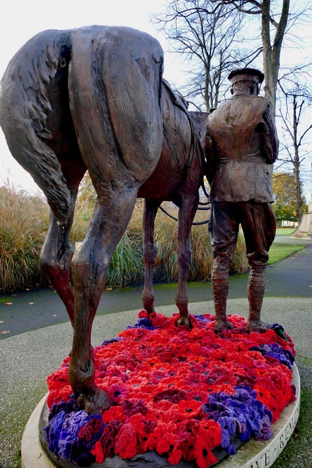 The Romsey War Horse Sculpture is decorated with a sheath of knitted poppies. Knitted poppies are on display in Romsey Abbey, The War Memorial Gardens, the War Memorial Statue and post boxes around the Hampshire market town in preparations for Sundays Remembrance Day Services., Credit:Geoffrey Swaine / Avalon