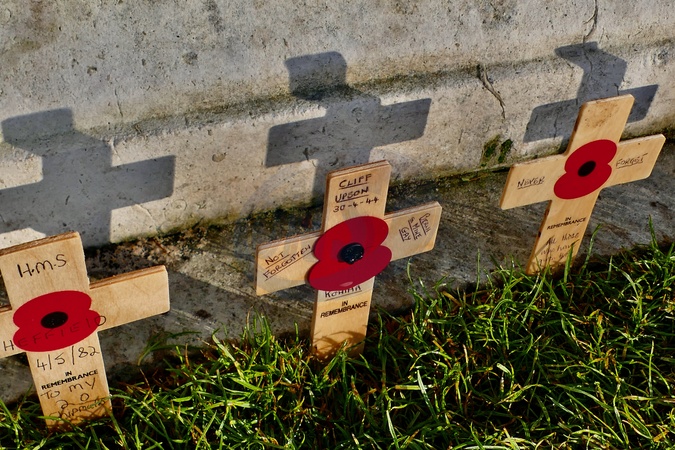 Poppies on display in the war memorial park. Knitted poppies are on display in Romsey Abbey, The War Memorial Gardens, the War Memorial Statue and post boxes around the Hampshire market town in preparations for Sundays Remembrance Day Services., Credit:Geoffrey Swaine / Avalon