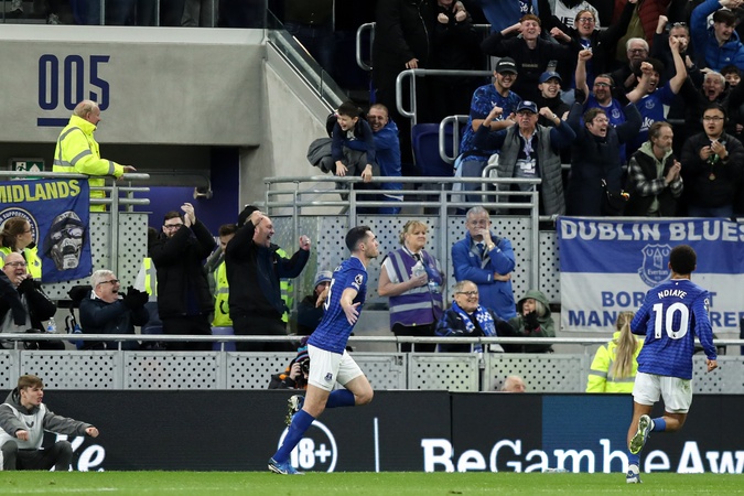 Michael Keane of Everton scores and celebrates after making it 2-0 during the Premier League match Everton vs Fulham at Hill Dickinson Stadium, Liverpool, United Kingdom, 8th November 2025, Credit:Jorge Horsted/News Images / Avalon