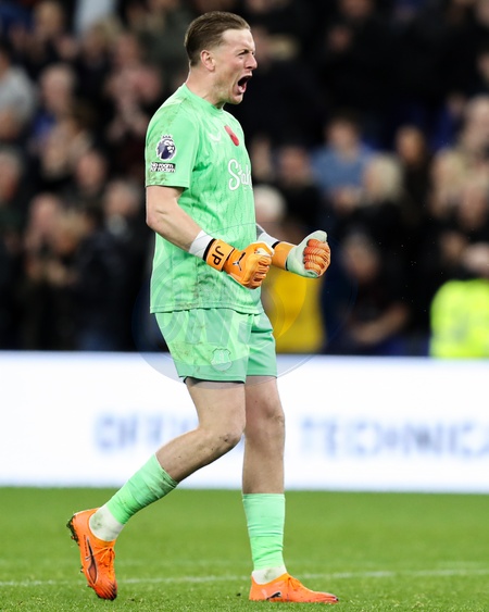 Jordan Pickford of Everton celebrates full time whistle during the Premier League match Everton vs Fulham at Hill Dickinson Stadium, Liverpool, United Kingdom, 8th November 2025, Credit:Jorge Horsted/News Images / Avalon