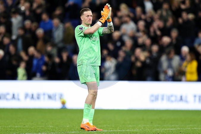Jordan Pickford of Everton celebrates full time whistle during the Premier League match Everton vs Fulham at Hill Dickinson Stadium, Liverpool, United Kingdom, 8th November 2025, Credit:Jorge Horsted/News Images / Avalon