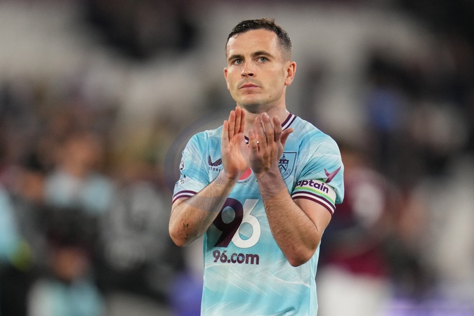 Josh Cullen of Burnley applauds away supporters at full time during the Premier League match West Ham United vs Burnley at London Stadium, London, United Kingdom, 8th November 2025, Credit:Harvey Murphy/News Images / Avalon