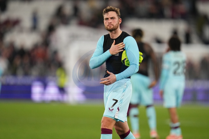 Jacob Bruunlarsen of Burnley to away support during the Premier League match West Ham United vs Burnley at London Stadium, London, United Kingdom, 8th November 2025, Credit:Harvey Murphy/News Images / Avalon