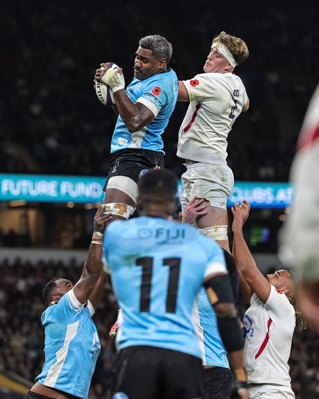 Kitione Salawa of Fiji jumps up to win the ball in a lineout from Alex Coles of England during the Quilter Nations Series 2025 match England vs Fiji at Allianz Stadium, Twickenham, United Kingdom, 8th November 2025, Credit:Mark Cosgrove/News Images / Avalon