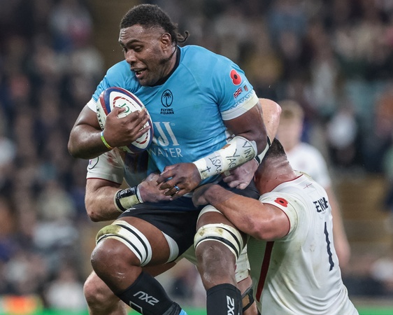 Elia Canakaivata of Fiji is tackled by Ellis Genge and Joe Heyes of England during the Quilter Nations Series 2025 match England vs Fiji at Allianz Stadium, Twickenham, United Kingdom, 8th November 2025, Credit:Mark Cosgrove/News Images / Avalon