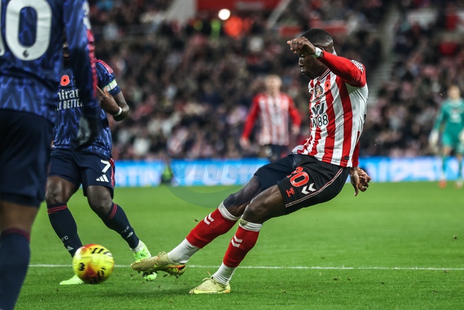 Nordi Mukiele of Sunderland takes a shot on goal during the Premier League match Sunderland vs Arsenal at Stadium Of Light, Sunderland, United Kingdom, 8th November 2025, Credit:Ae Cosgrove/News Images / Avalon