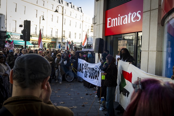 Sudanese activists and supporters gathered in Central London to protest against atrocities committed by the Rapid Support Forces (RSF) following their capture of Al Fashir from government forces. Demonstrators condemned the recent massacres and called for international intervention to stop the ongoing violence. Protesters waved Sudanese flags, chanted for peace and justice, and demanded accountability for war crimes committed in the Darfur region., Credit:Zak Irfan / Avalon