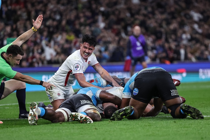 Ellis Genge of England goes over for a try during the Quilter Nations Series 2025 match England vs Fiji at Allianz Stadium, Twickenham, United Kingdom, 8th November 2025, Credit:Mark Cosgrove/News Images / Avalon