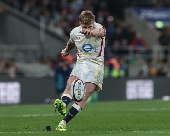 Fin Smith of England converts for a goal during the Quilter Nations Series 2025 match England vs Fiji at Allianz Stadium, Twickenham, United Kingdom, 8th November 2025, Credit:Mark Cosgrove/News Images / Avalon
