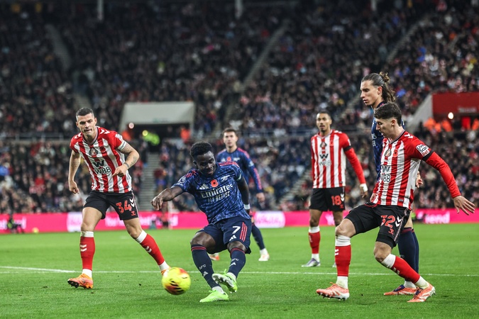 Bukayo Saka of Arsenal takes a shot on goal during the Premier League match Sunderland vs Arsenal at Stadium Of Light, Sunderland, United Kingdom, 8th November 2025, Credit:Ae Cosgrove/News Images / Avalon