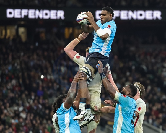 Mesake Vocevoce of Fiji jumps up to win the ball in a lineout during the Quilter Nations Series 2025 match England vs Fiji at Allianz Stadium, Twickenham, United Kingdom, 8th November 2025, Credit:Mark Cosgrove/News Images / Avalon