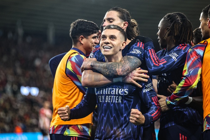 Leandro Trossard of Arsenal celebrates his goal to make it 1-2 during the Premier League match Sunderland vs Arsenal at Stadium Of Light, Sunderland, United Kingdom, 8th November 2025, Credit:Ae Cosgrove/News Images / Avalon