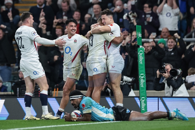 Henry Arundell of England celebrates his try during the Quilter Nations Series 2025 match England vs Fiji at Allianz Stadium, Twickenham, United Kingdom, 8th November 2025, Credit:Mark Cosgrove/News Images / Avalon