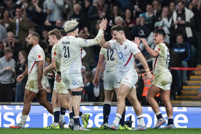 Henry Arundell of England celebrates his try with Henry Pollock of England during the Quilter Nations Series 2025 match England vs Fiji at Allianz Stadium, Twickenham, United Kingdom, 8th November 2025, Credit:Mark Cosgrove/News Images / Avalon