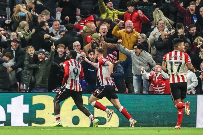 Marc Guiu of Sunderland celebrates his goal to make it 2-2 during the Premier League match Sunderland vs Arsenal at Stadium Of Light, Sunderland, United Kingdom, 8th November 2025, Credit:Ae Cosgrove/News Images / Avalon