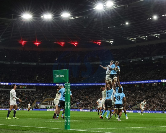 Kitione Salawa of Fiji jumps up to win the ball in a lineout from Alex Coles of England during the Quilter Nations Series 2025 match England vs Fiji at Allianz Stadium, Twickenham, United Kingdom, 8th November 2025, Credit:Mark Cosgrove/News Images / Avalon