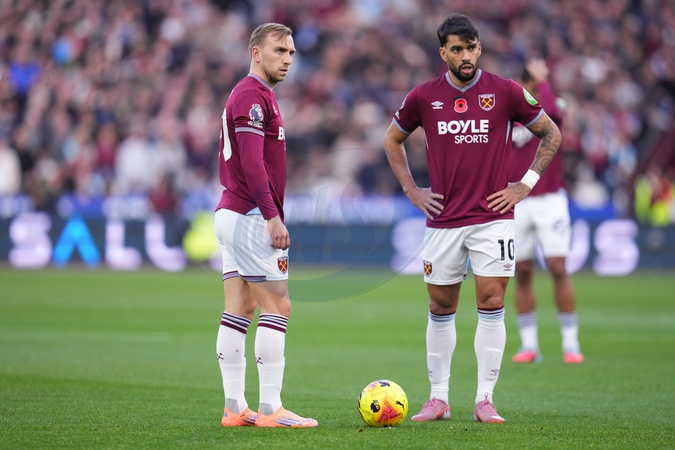 Jarrod Bowen of West Ham United and Lucas Paqueta of West Ham United during the Premier League match West Ham United vs Burnley at London Stadium, London, United Kingdom, 8th November 2025, Credit:Harvey Murphy/News Images / Avalon