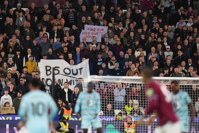 West Ham supporters hold protest banners during the Premier League match West Ham United vs Burnley at London Stadium, London, United Kingdom, 8th November 2025, Credit:Harvey Murphy/News Images / Avalon