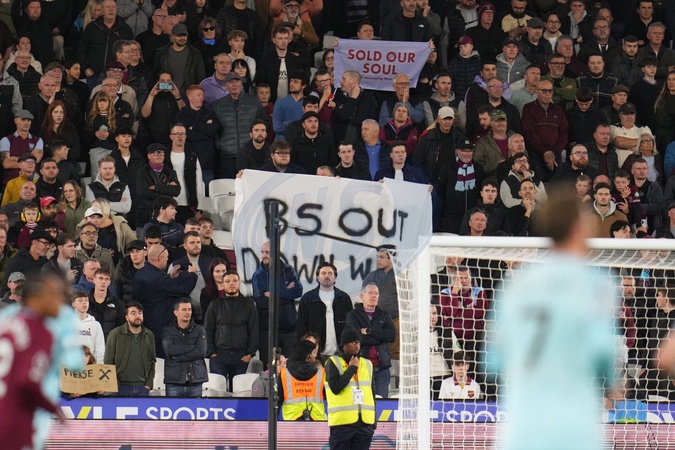 West Ham fans hold protest banners during the Premier League match West Ham United vs Burnley at London Stadium, London, United Kingdom, 8th November 2025, Credit:Harvey Murphy/News Images / Avalon