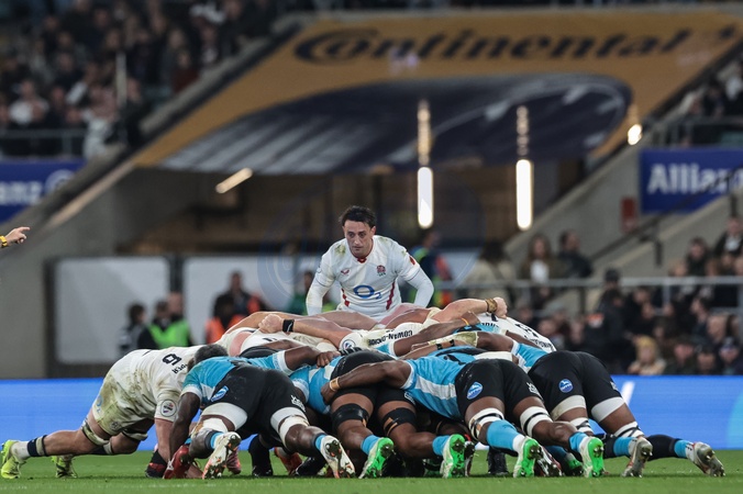 Alex Mitchell of England looks over the scrum during the Quilter Nations Series 2025 match England vs Fiji at Allianz Stadium, Twickenham, United Kingdom, 8th November 2025, Credit:Mark Cosgrove/News Images / Avalon
