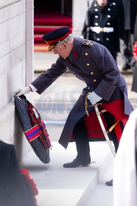 Charles, His Majesty The King leads the UK in the annual two-minute silence to remember those who have fallen and suffered in conflict at the National Service of Remembrance at the Cenotaph. The King is joined by members of The Royal Family, the Prime Minister, senior politicians and faith representatives to mark the Armistice of the First World War and all other conflicts involving British and Commonwealth forces., Credit:Joanne Davidson / Avalon